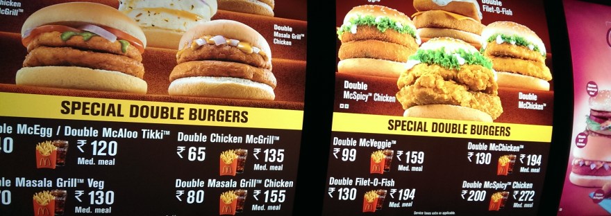I know I can’t be the only one out there fascinated by McDonald’s changing menu around the world. I snapped some photos while on my trip. Here is the menu board of McDonald’s India as well as a pic of my meal. You’ll notice the lack of beef on offer.