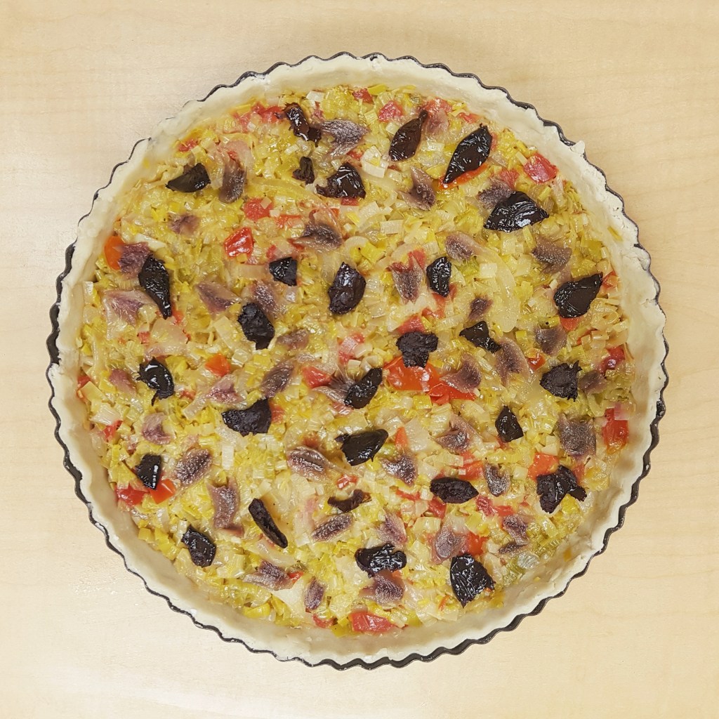 Pre-heat the oven to 375F (365F convection). Remove the pie dough-lined tart pan and the round of pie dough from the freezer. Remove the onion mixture from the fridge and discard the strained liquid. (At this point, I like to taste the onion mixture and assess how salty it is. Try a mouthful with a small piece each of anchovy and olive; this is how the finished pie filling will taste. Is the balance right? If you need to add more salt to the onion mix, now is the time. Spoon the onion mix into the dough-lined tart pan. Top the onion mixture with pieces of anchovies and olives to ensure every slice of pie contains every ingredient (see photo of filled pie). Brush the exposed rim of dough around the lip of the tart pan with water to help seal the top and bottom layers. Lay the round of pie dough on top of the onion mix and seal both doughs together by pressing them with your fingers. Trim off the excess dough. Cut slits into the top layer of dough to ensure steam can escape during cooking.